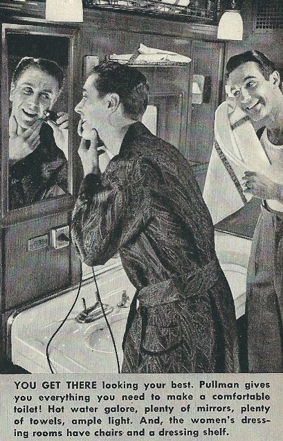 Here is a vintage Pullman advertisement showing two gentlemen in a men’s washroom. Very nostalgic. This is grand, but aboard DOVER HARBOR your experience is even better! Each bedroom has its own sink, razor outlet, toilet, and there are plenty of towels. So the next time you travel, go the way Americans have been doing it for more almost a century, travel with us aboard DOVER HARBOR. Avoid the hassles of the security, the cramped conditions on a plane, and those long drives. We don’t serve airport or fast food!