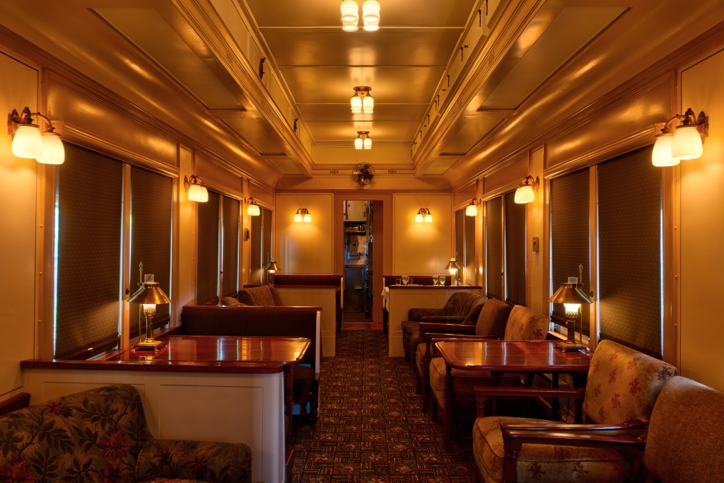 A view of the lounge of the car which seats comfortably seats 24 people, including 12 dinette seats, 2 settees, and easy chairs. This view is looking toward the vestibule end of the car away from the kitchen. Photo by Dennis Dame.
