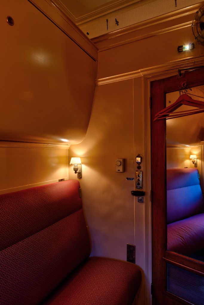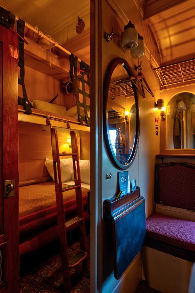 Adjoining double bedrooms. Each has an upper and a lower berth which fold up during the day, a sink, a toilet, a writing desk, a window, and small amenities. All beautifully restored to its 1934 elegance and complete with a reproduction Pullman Blankets. In this photo the room on the left is in the night time position as seen through the door. In the room on the right, which is a mirror opposite of the one on the left the little seat covers the toilet and the seat back folds down to become a sink. Photo by Dennis Dame